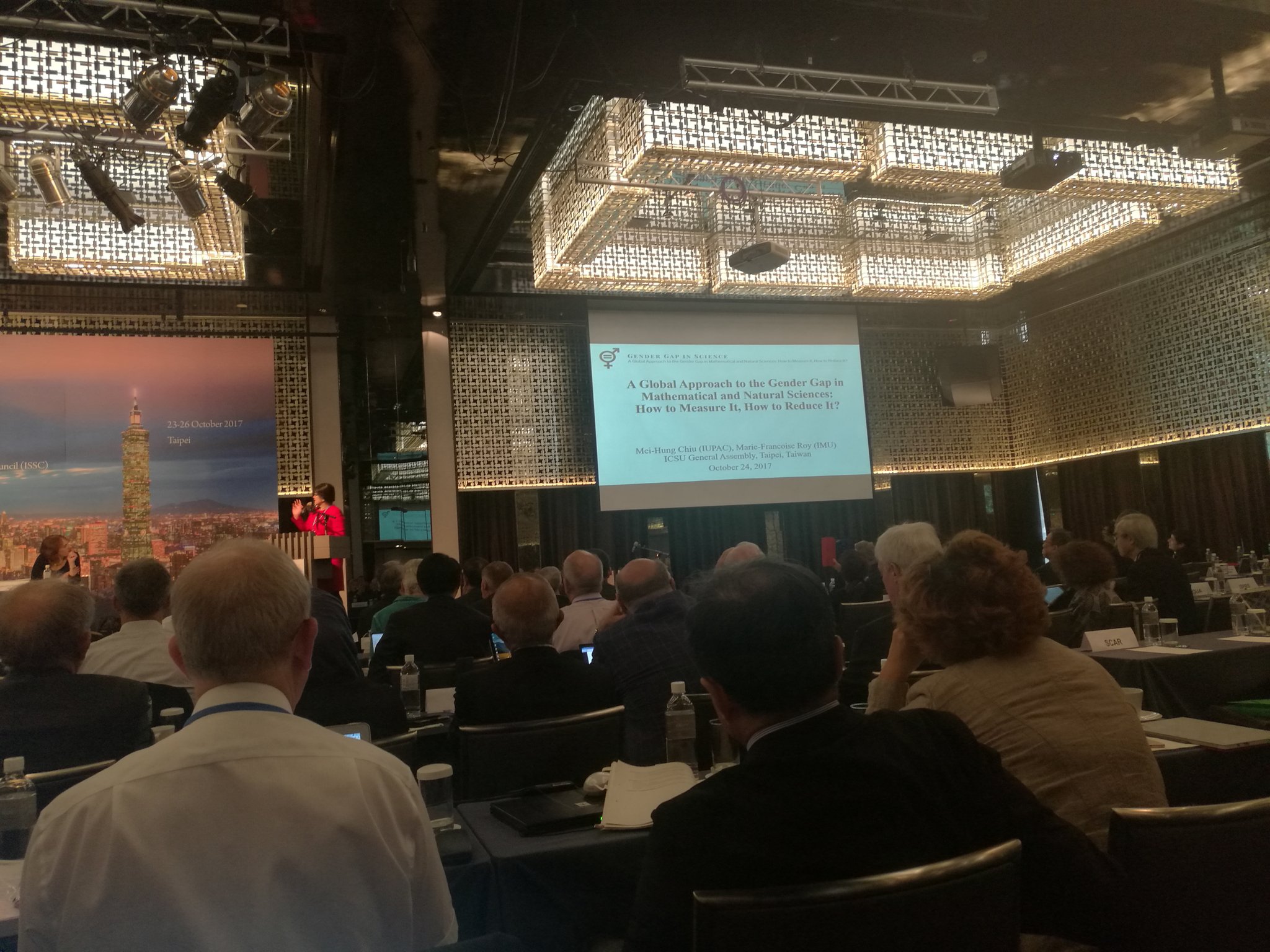 A progress report for the Gender Gap project was presented by Mei-Hung Chiu (a IUPAC bureau member) and Marie-Francoise Roy (IMU) at the ICSU GA in Taipei, Taiwan, on October 24, 2017. Participants at the assembly provided useful input and positive comments to the project and recognized the values of carrying out such a study for the promotion of gender equity and equality in the world.