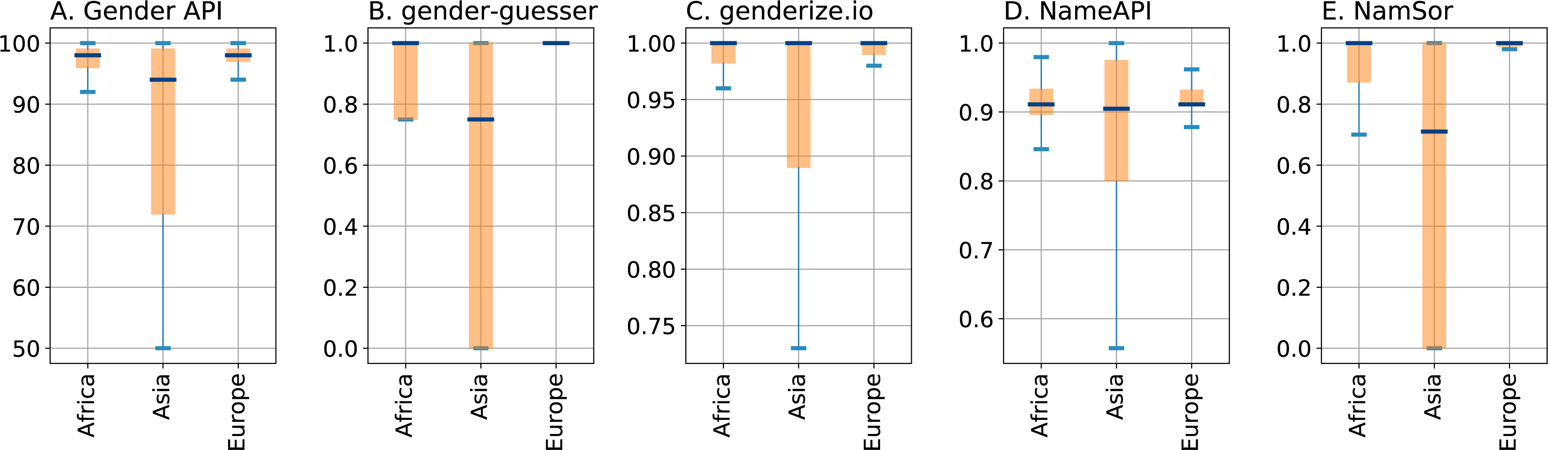 The cultural and geographic origin of names is known to have a great effect on the reliability of gender inference methods. That’s why a crucial aspect of our analysis is the estimation of the names’ origin, which we carry out using NamSor’s origin API. To illustrate this point, we have split the evaluations among African, Asian, and European names. (American and Australian names are considered to descend from the three regions above through migratory phenomena.)