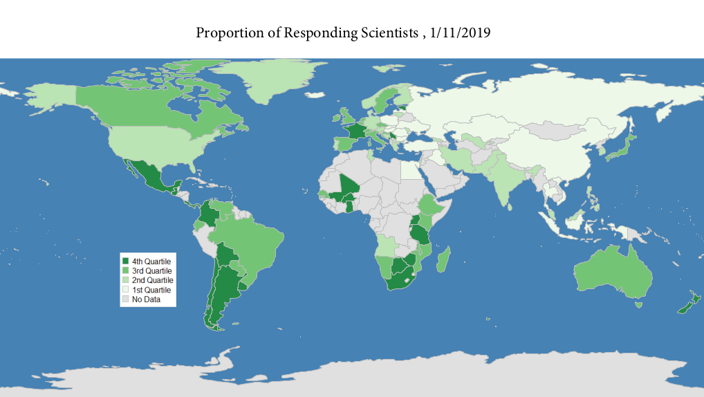 Six months after the opening of the 2018 Global Survey of Mathematical, Computing, and Natural Scientists, about 23 500 answers have already been collected, yet we were aiming at reaching 45 000 respondents. During this last month of accepting answers, focused efforts must therefore be made in all geographical zones and all disciplines to reach our target.